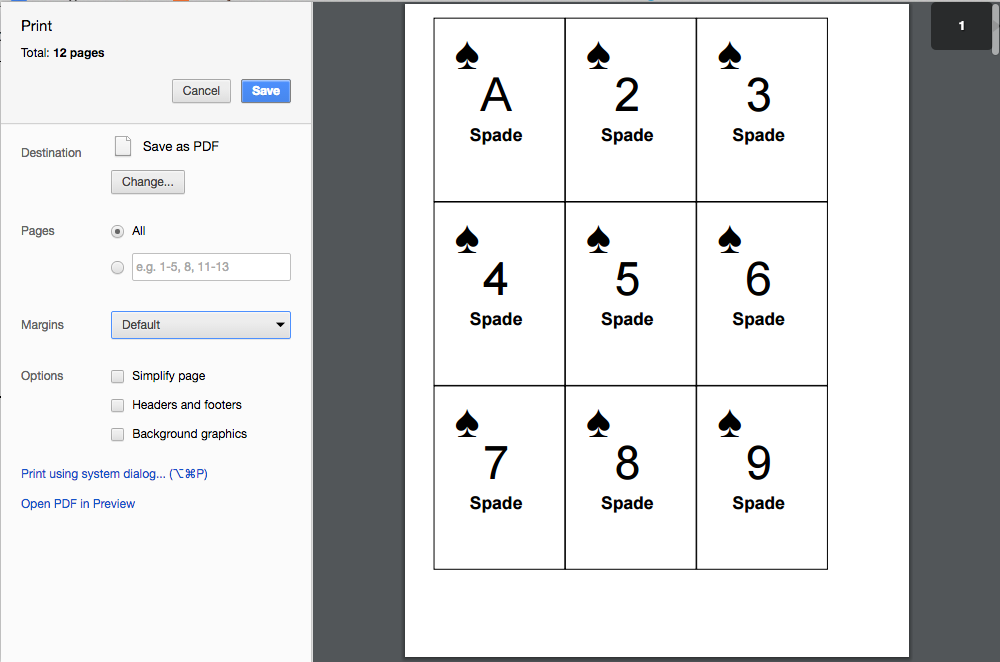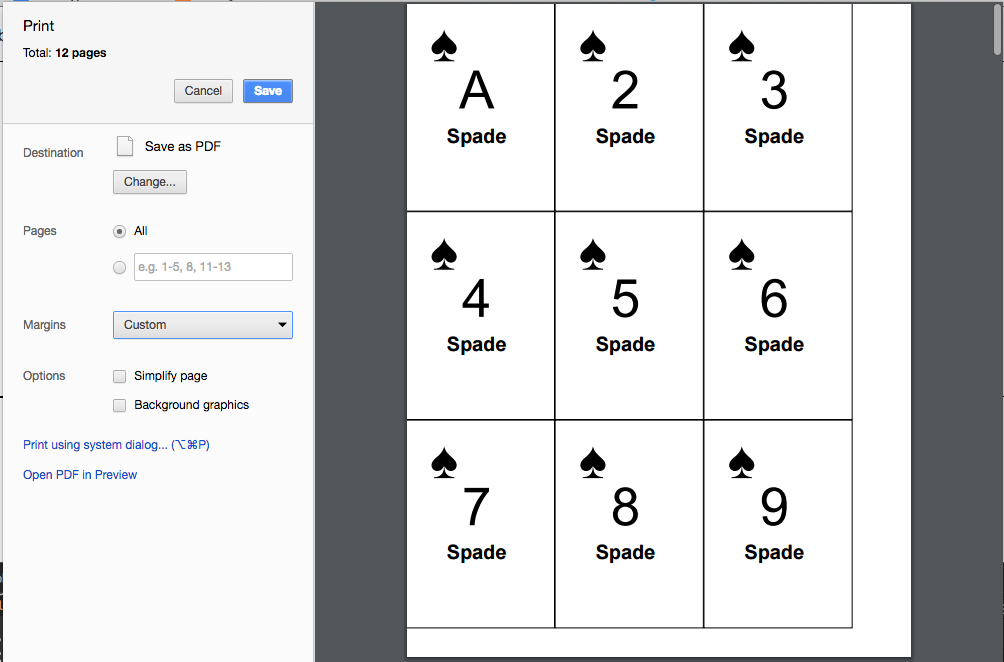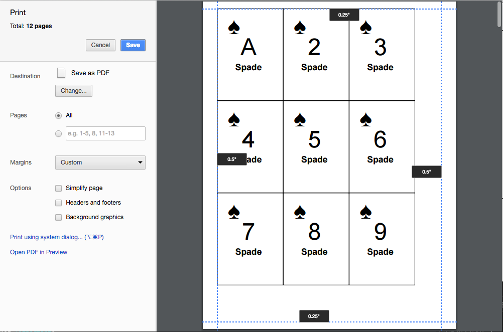 如果你打开这个页面上的打印预览(我正在用铬进行测试),你会发现卡的中心离中心很远。不过,事情是这样的--我的卡片被设置为2.5英寸乘3.5英寸,页面本身被设置为8.5英寸乘11英寸。这意味着我应该在左右之间有大约1英寸的边距,在顶部和底部有0.5英寸的边距,这意味着我的边距在逻辑上应该减半。然而,如果我真的这么做,它看起来就压扁了: