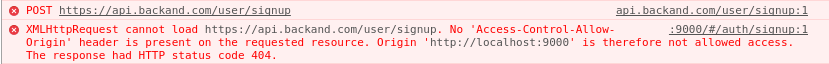 这是ajax通过javascript调用的一个常见问题。发生这种情况是因为通过javascript ajax调用不允许跨域请求。在您的示例中,您正在执行从域本地主机到api.backend.com的请求。浏览器检查所请求的服务器是否在响应标头中设置了标头Access-Control-Allow- Origin