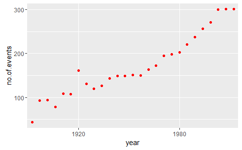 ggplot(data = supertable,aes(x=year,y=no.of.events))+geom_point(colour='red')+