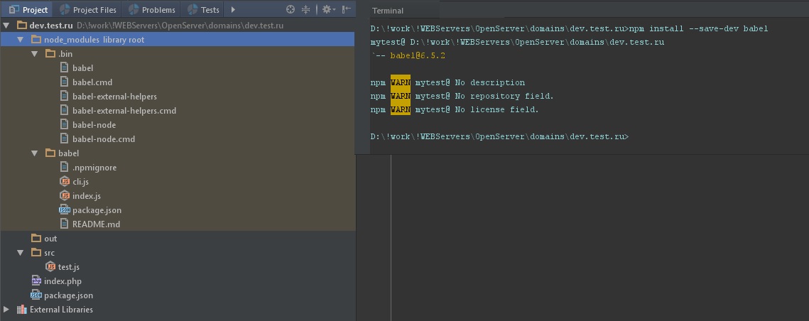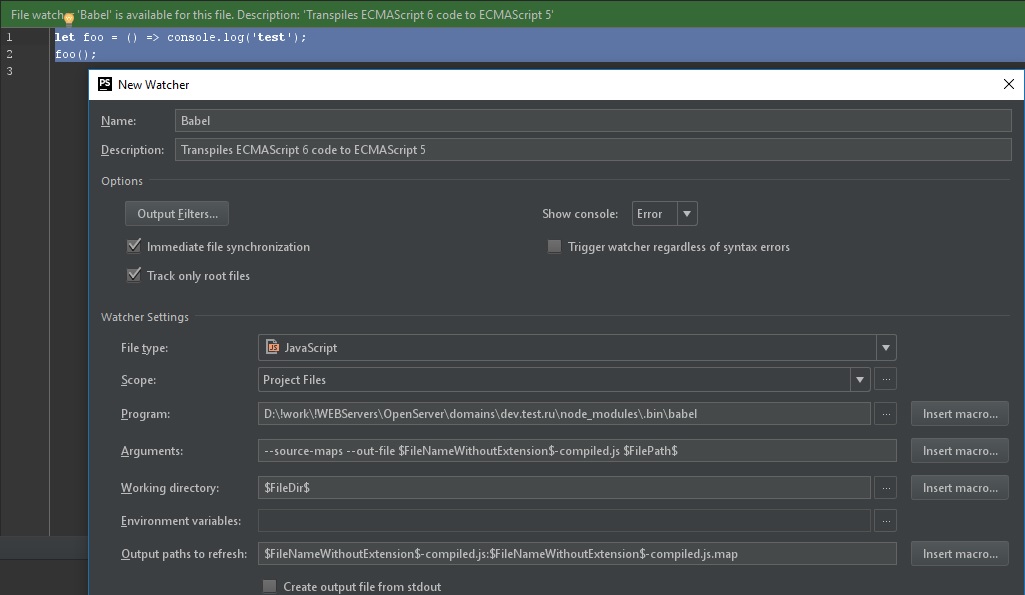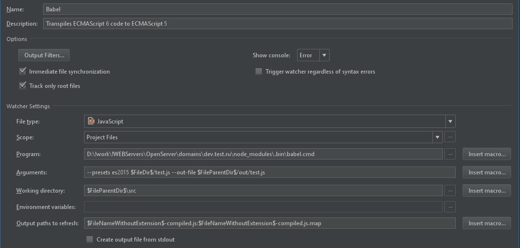 程序- D:!work!WEBServers\OpenServer\domains\dev.test.ru\node_modules\.bin\babel (或带有宏的$FileParentDir$\node_modules\.bin\babel.cmd )