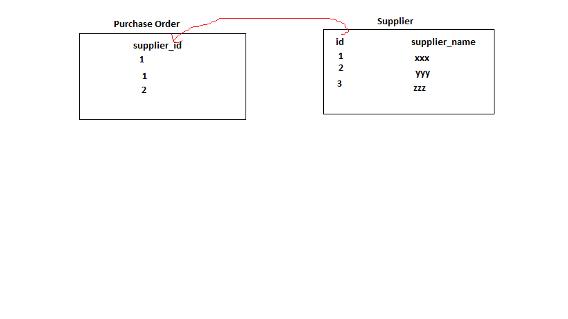 我有两个表1.购买订单表和另一个是2供应商表。在它们之间的对外关系是there(Supplier_id存在于采购订单表中。