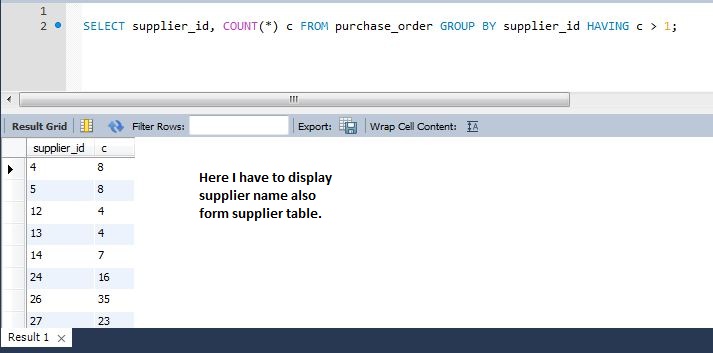 在采购订单中,supplier_id可能是重复的,因此我的要求是,我需要查询以计数重复的supplier_id,并根据supplier_id从供应商表中获取供应商名称。