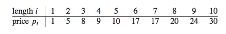 棒材切割的问题如下.给定一根长度为n英寸的棒子和一张i = 1, 2, 3,....n的价格表( Pi for i = 1, 2, 3,....n),确定Rn获得的最大收益--通过切割杆和出售产品。请注意,如果长度为Pn的杆的价格n足够大,则最优解可能根本不需要切割。