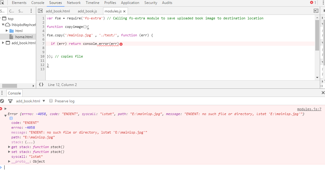 错误{errno:-4058,代码:"ENOENT",syscall:" lstat ",path:"E:\Development\Node apps\Node softwares\Digital_library\mainisp.jpg",消息:"ENOENT:没有这样的文件或目录,lstat 'E:\Devel…app\Node softwares\Digital_library\mainisp.jpg'"}