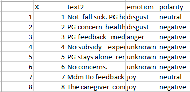 我实际上想用if或if等语句来改变csv文件中的情绪和极性(见附图)。我之所以想改变情绪和极性,是因为有些人是不正确的。例如,如果在text2下,它是“不关心”,“不关心”,或者“不关心”,它的情感应该是未知的,极性应该是中性的。
