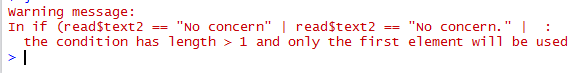if(text2 == "No concern" | text2 == "No concern." | text2 == "No concerned" | text2 == "No concerns." | text2 == "No concerns") {