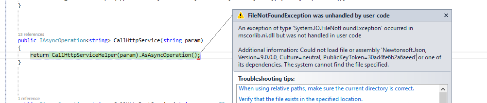 Additional information: Could not load file or assembly 'Newtonsoft.Json, Version=9.0.0.0, Culture=neutral, PublicKeyToken=30ad4fe6b2a6aeed' or one of its dependencies. The system cannot find the file specified.