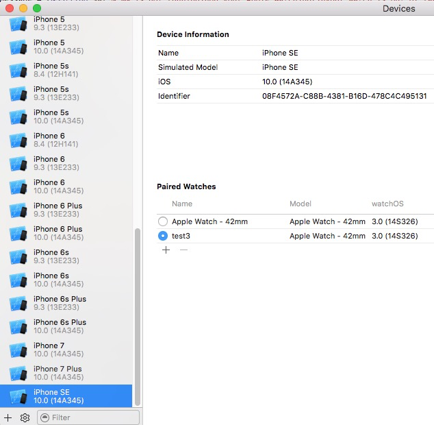 我正在运行Xcode 8 beta 5,我的应用程序有一个手表扩展。我不能把iPhone模拟器和手表模拟器配对。我遵循了配对指令(Xcode,Window,Device),但是没有列出任何手表模拟器,当我选择任何iPhone模拟器时也没有列出。我尝试过Add模拟器的变体,但我只得到了更多的iPhone模拟器--我从来没有在那里看到过手表模拟器或配对。手表模拟器存在--我可以启动模拟器,但它不是成对的。我试过删除Xcode并重新安装。测试版4也有同样的问题。