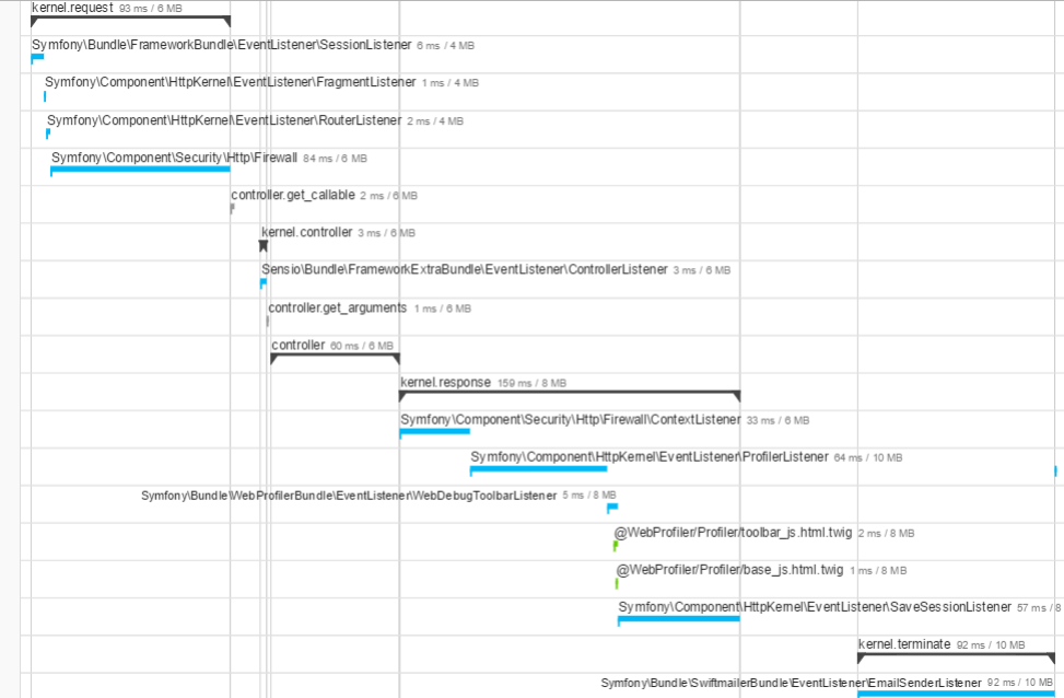 我安装了Symfony3框架-标准版本.我试图打开主页(app.php prod),它加载了300-400 is。这是我的分析器信息: