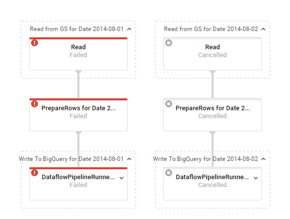 在这张图片中,有2个平行源和2个平行汇,由于2014-08-01年的源数据有一些错误,第一次转换失败了。一旦2014-08-01转换失败,2014-08-02转换被取消.2014-08-02年的转换没有坏的数据。