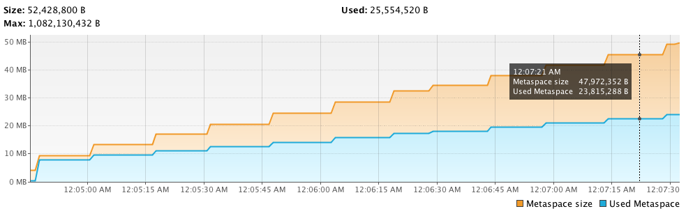 我编写了一个模拟MetaSpace OOM的程序。但是我发现MetaSpace Size几乎总是比Used MetaSpace大两倍。为什么?