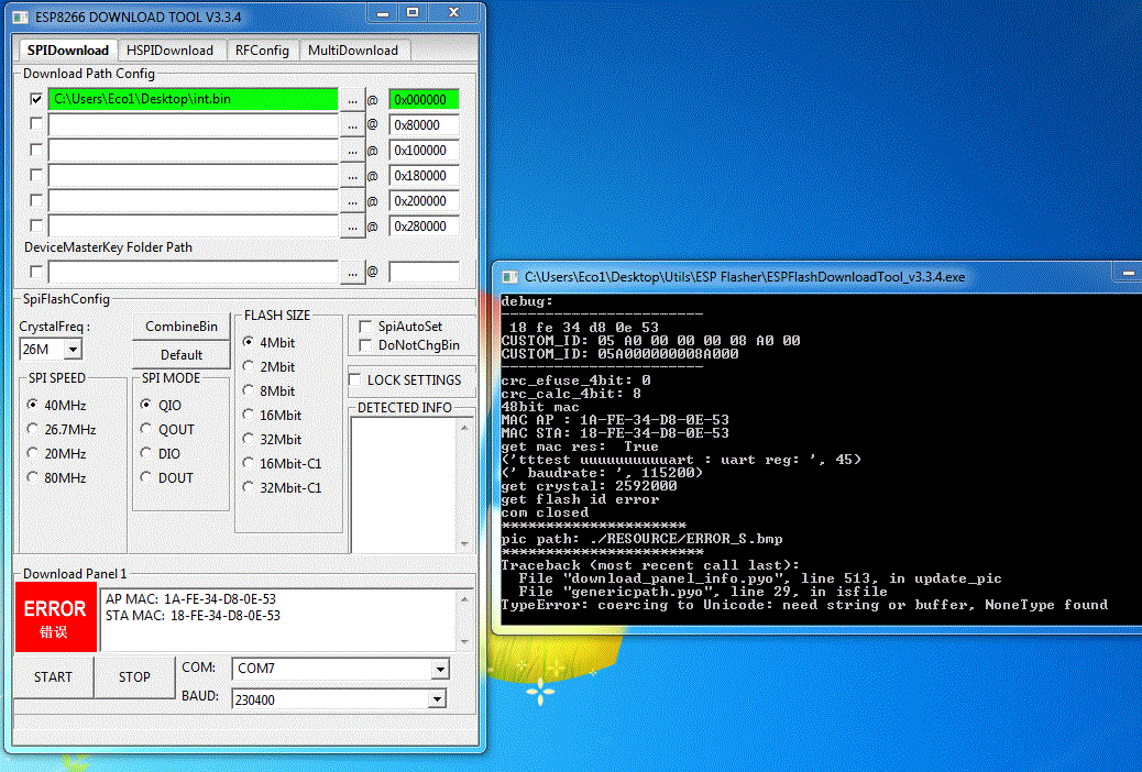 来自Espressif的ESP8266下载工具无法对闪存进行编程,esptool也是如此。有趣的是:我实际上可以同时读取AP和电台的MAC。