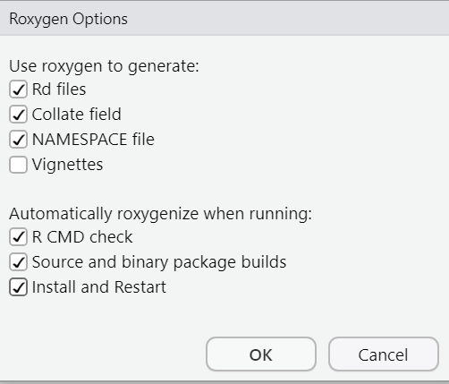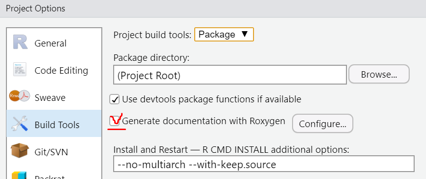 在项目选项下的Rstudio中,有一个包含roxygen项的generate文档--检查它。