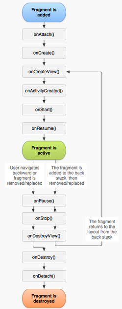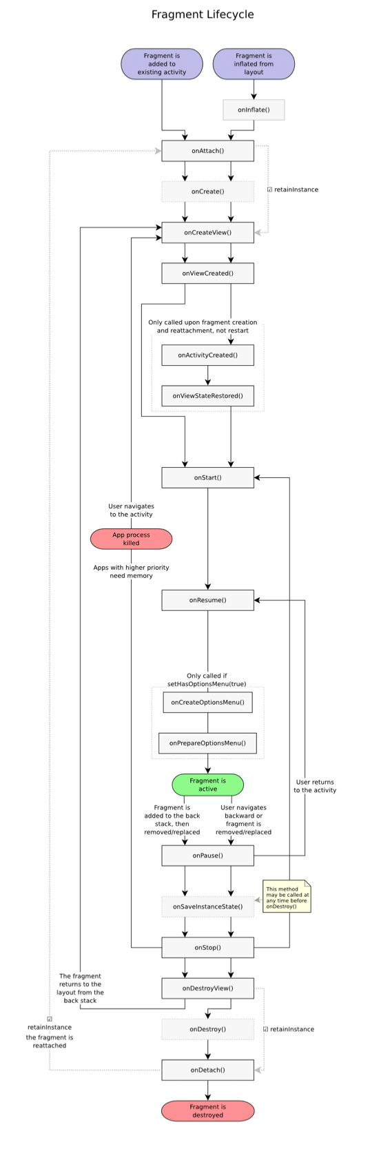 现在,当您创建一个片段时,它会被充气到活动中。它有自己的一组生命周期事件/方法,这些事件/方法被调用,并且由于片段被充气到活动中,当您的活动状态发生变化时,它会影响片段,并相应地调用片段的不同生命周期方法。下面是活动的生命周期方法与片段之间关系的另一个图形表示。
