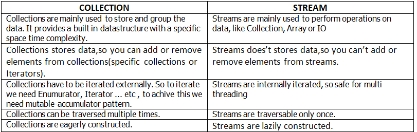 集合是内存中的数据结构,它保存数据结构当前拥有的所有值,在将其添加到集合之前必须计算集合中的每个元素。相反,流是按需计算元素的概念固定的数据结构。