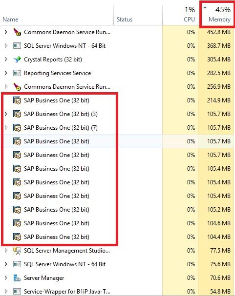 在服务器上,SAP进程没有关闭,昨天我注意到服务器内存已满(利用率为100%),而只有一个用户登录。在任务管理器上,我们有超过100个SAP进程正在运行。我不得不手动关闭所有的服务,在此之后,SAP 9.2在网络上开始顺利运行。
