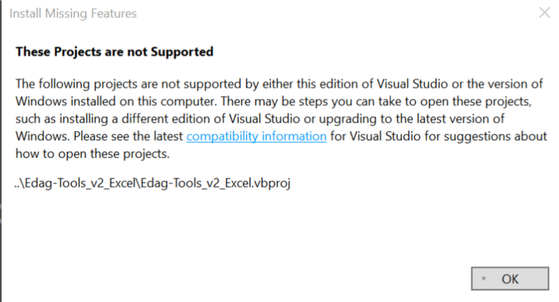然而,在表层书上,我只能打开普通的人。两个VSTO项目不能打开。当尝试加载它们(或单击)时,我得到以下消息: