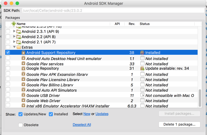 下面的对话框将出现。向下滚动到“临时”,并找到'Android支持仓库‘。检查它,然后单击“安装软件包.”