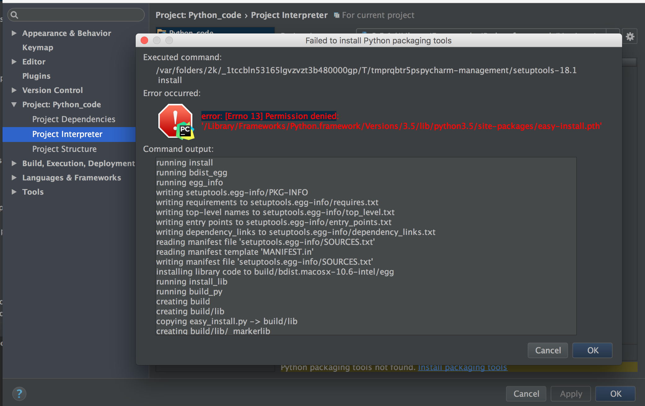 当您在没有必要权限的情况下尝试从PermissionError: [errno 13] permission denied访问文件时,就会发生PermissionError: [errno 13] permission denied错误。在您的例子中,文件(或目录??)值得关注的是/var/folders/2k/_1tccbln53165lgvzvzt3b480000gp/T/tmprqbtrpspycharm-management/setuptools-18.1。您可能希望使用chmod或chown来更改对它的访问权限。