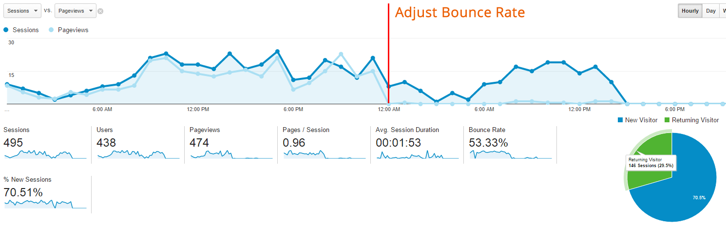在第一次点击时就开始了一次会话,无论是事件还是页面浏览。按常规发送页面查看,然后在会话第一次页面查看的10秒计时器上,您可以发送一个交互事件(默认),作为您的弹出率调整。