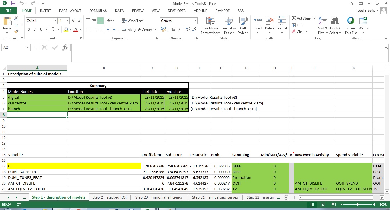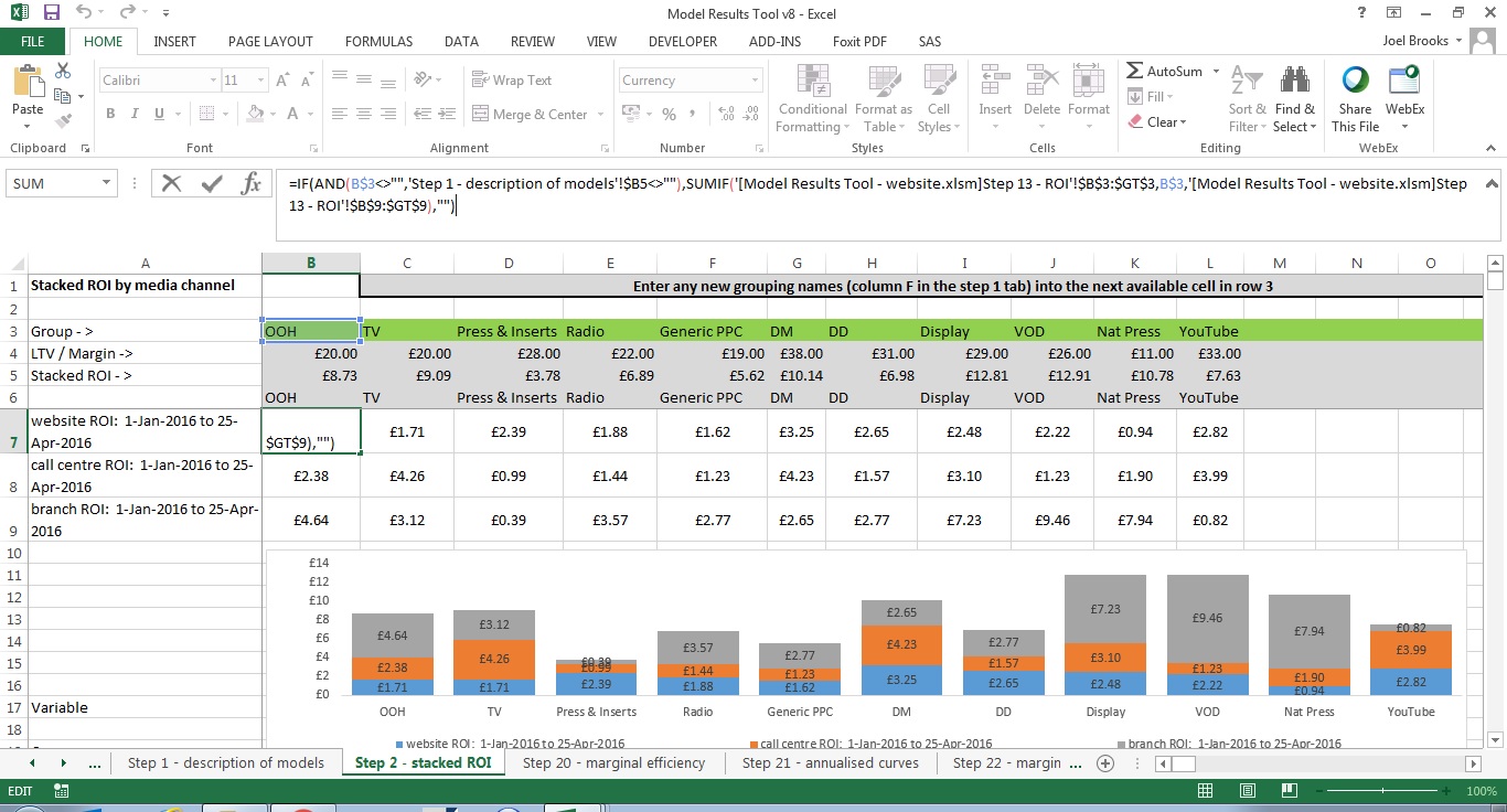 =IF(AND(B$3<>"",'Step 1 - description of models'!$B5<>""),SUMIF('[Model Results Tool - website.xlsm]Step 13 - ROI'!$B$3:$GT$3,B$3,'[Model Results Tool - website.xlsm]Step 13 - ROI'!$B$9:$GT$9),"")其中,B$3<>""检查只是确保该度量有一个列标题,而'Step 1 - description of models'!$B5<>""检查则确保Model Results Tool - website.xlsm模型已列在首页参考列表中。注意:这是一个包含在项目中的模型列表。他们的名字和数量将改变项目的项目,所以这似乎是最明智的方法。