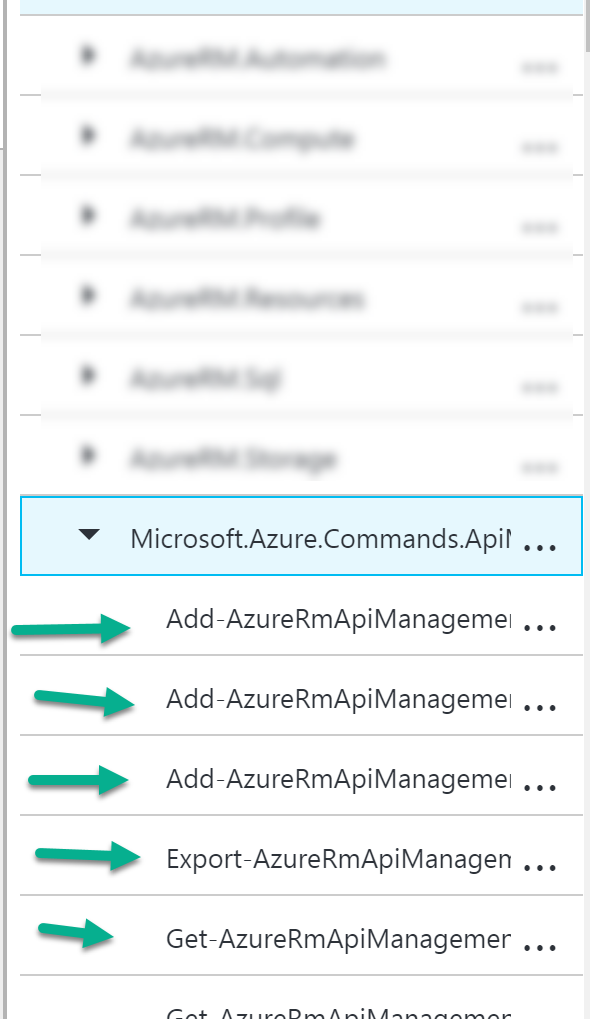 我意识到Azure自动化缺少所需的APIM命令,所以我导入了它们。我现在可以在我的自动化资产中看到这些:
