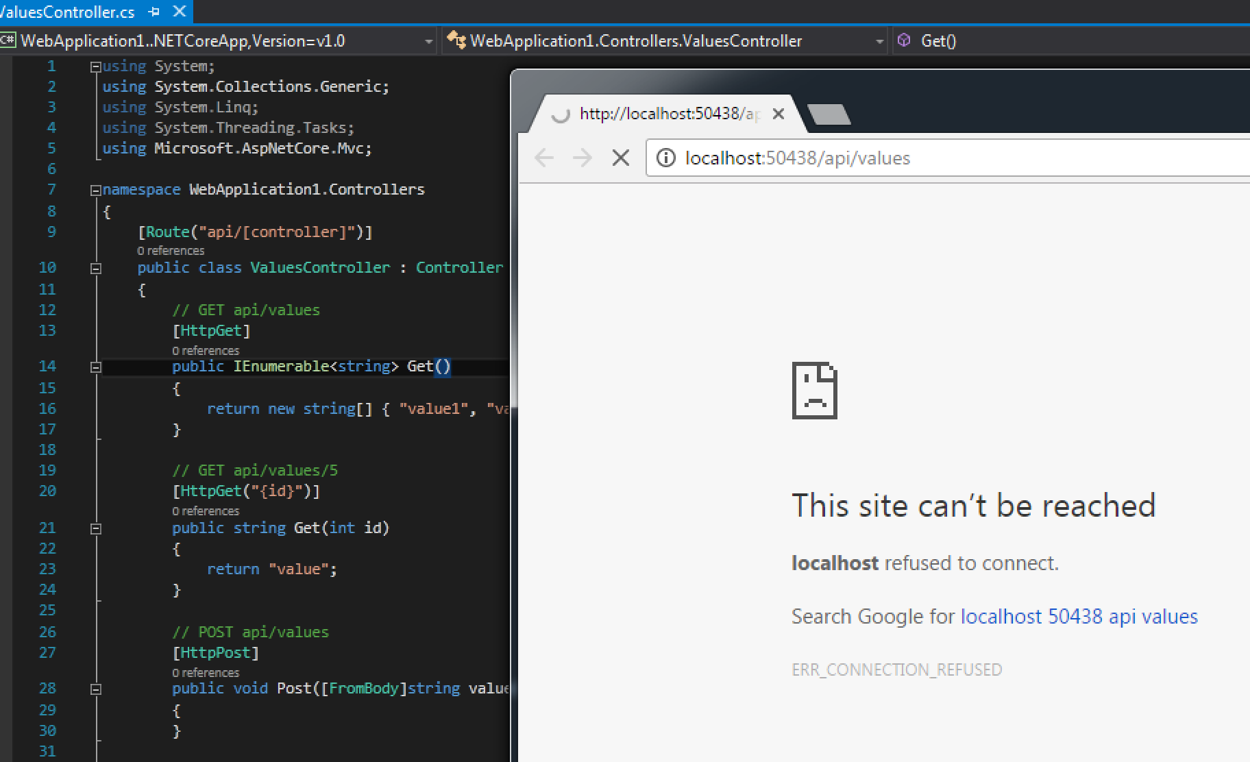 我刚刚创建了一个.NET核心WebApi解决方案,尽管当我点击F5启动它时,浏览器会显示“无法到达的站点”并停止调试。我在下面包括了一个屏幕截图。
