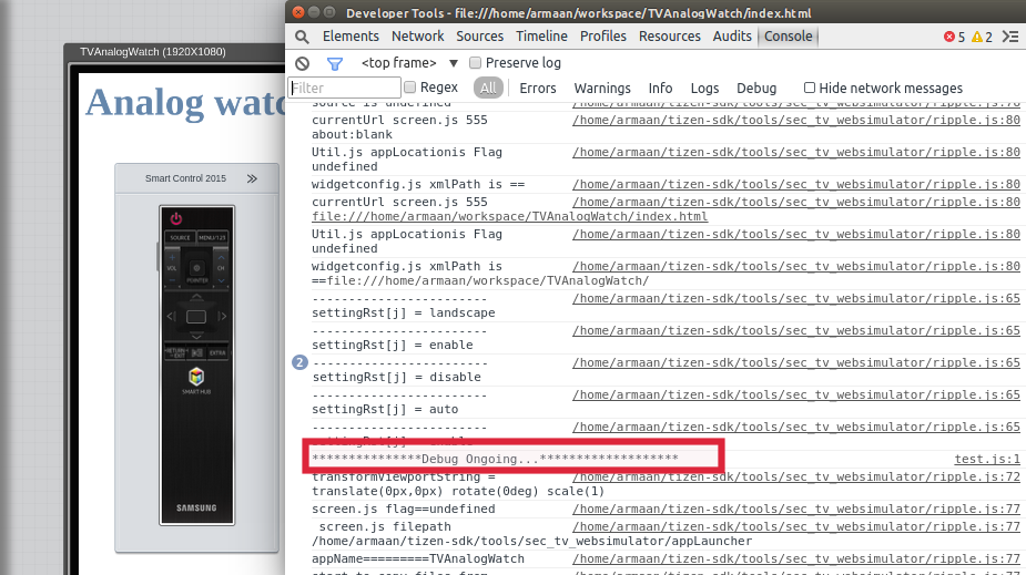 我们买了一台三星智能电视,安装在墙上,展示我们公司的仪表盘。我用HTML/Javascript/CSS编写了仪表板,一切都很顺利。我觉得把它显示在大屏幕上是很舒服的。然而,大多数数据没有加载。我不知道如何访问任何类型的控制台。我尝试过更改我的代理字符串以匹配Chrome工具,但这当然不能模拟功能。我还从三星的网站下载了“2014年智能电视仿真器5.1”,并在VirtualBox上运行,但据我所知,你只能使用它来调试和模仿原生Tizen应用程序。我不知道如何在模拟的集合上启动浏览器。