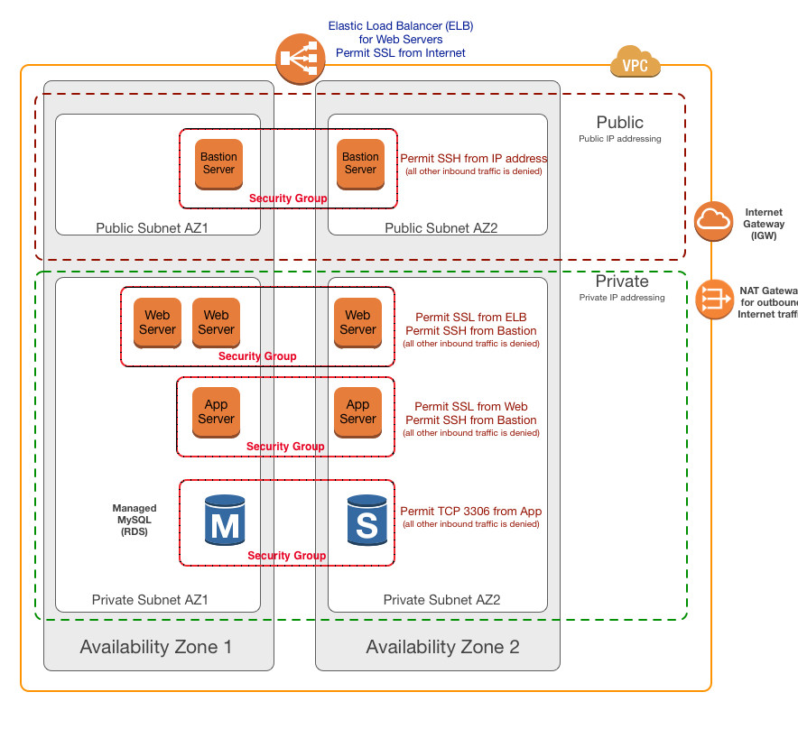 下面是示例图,它来自于一篇关于AWS中的网络隔离的文章。请注意每个安全组是如何引用“上面”的一个的: