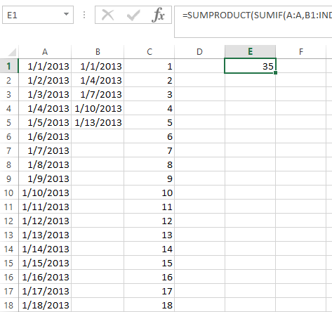 =SUMPRODUCT(SUMIF(A:A,B1:INDEX(B:B,MATCH(1E+99,B:B)),C:C))由于SUMPRODUCT是一个数组类型公式,我们需要限制B列中的范围,因为它将遍历该引用中的每个单元格。