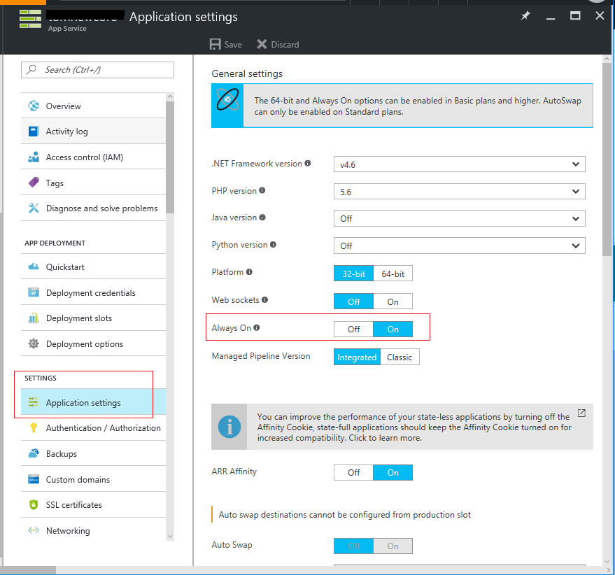 这是否意味着在Azure中,总是打开?默认情况下,它被关闭。如果我们不始终打开,,WebJob可能会在空闲时中止一段时间。如果Web应用程序空闲了一段时间,它们将被卸载。这使系统可以节省资源。请尝试设置始终保持程序加载的所有时间。更多请参考截图。