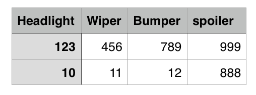 ["Headlight", "Wiper", "Bumper", "Spoiler"],