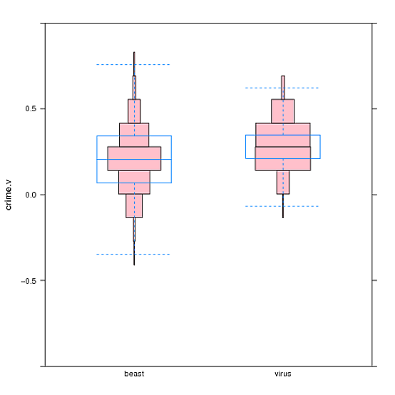这似乎是一群坏家伙最好的选择,派和甜甜圈的图表就是嘲笑。然后,我受到了这个创作Symmetrical, violin plot-like histogram?的启发,它创造了一种堆积分布的小提琴情节(见下文)。