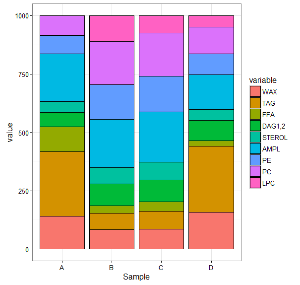 也许这是个愚蠢的想法,也可能是脑电波。我有4个不同物种的脂质类数据集。数据是成比例的,和是1000。我想形象化每个物种中每一个类别的比例差异。通常,堆叠栏是这里的方法,但是有几个类,而且它变得不可解释,因为只有底层类共享一个基线(见下文)。