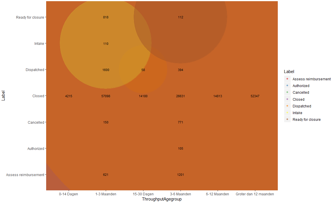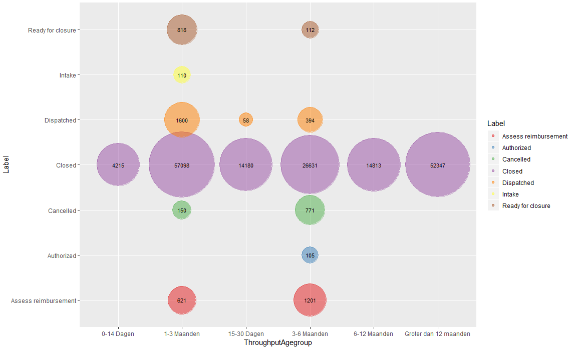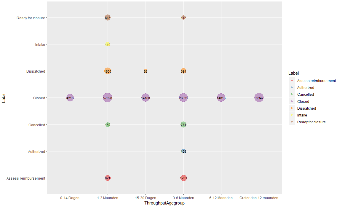 geom_point(aes(size=`Throughput`), alpha=0.5,aes(colour=`Label`))