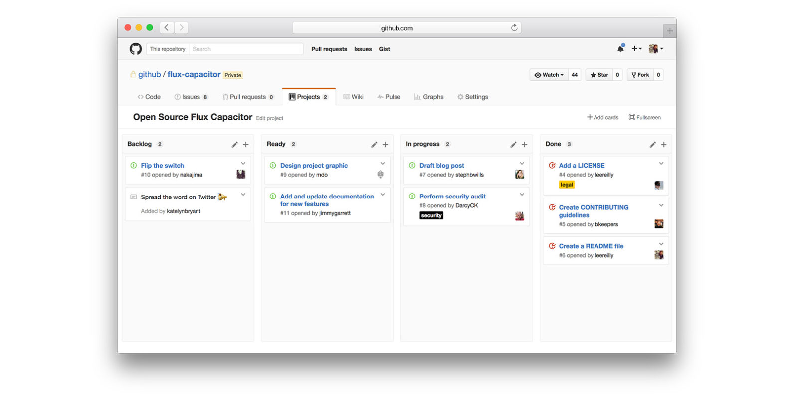 GitHub最近推出了一个名为项目的新特性。这提供了一个可视化的板,这是许多项目管理工具的典型:
