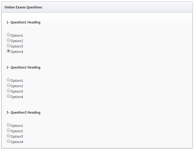 每个问题的选项都保存在数据库中,最小选项可以是3,最大选项可以是6。如何使用rp_Question中的其他中继器重复每个问题的选项。我想表现得像这样。