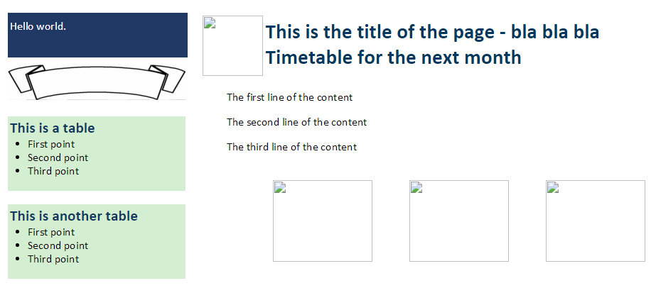 <p style='margin-left:2cm;font-size:22.0pt;margin-top:6pt;color:rgb(0,56,96)'><b>This is the title of the page - bla bla bla <br>Timetable for the next month</b></p>