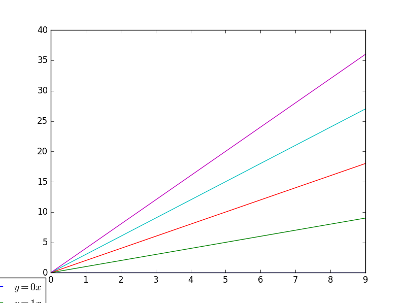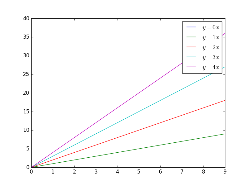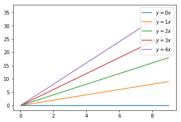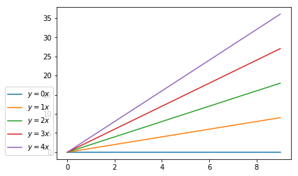 ax.plot(x, i * x, label='$y = %ix$' % i)