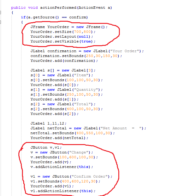 确认订单窗口应该是一个模态JDialog,而不是JFrame。您希望程序停止,直到用户处理完它,这就是模态对话框所要做的。另外,我会使用JSpinner而不是JTextFields来获取数量信息。为什么?您必须始终假定用户是白痴,使用JSpinner可以防止用户输入非数字或其他不正确的信息。