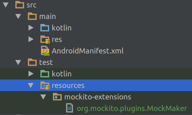 }正如Mockito文档(https://github.com/mockito/mockito/wiki/What%27s-new-in-Mockito-2,§Mock the unmockable)中提到的,我添加了org.mockito.plugins.MockMaker文件。这是我项目的树: