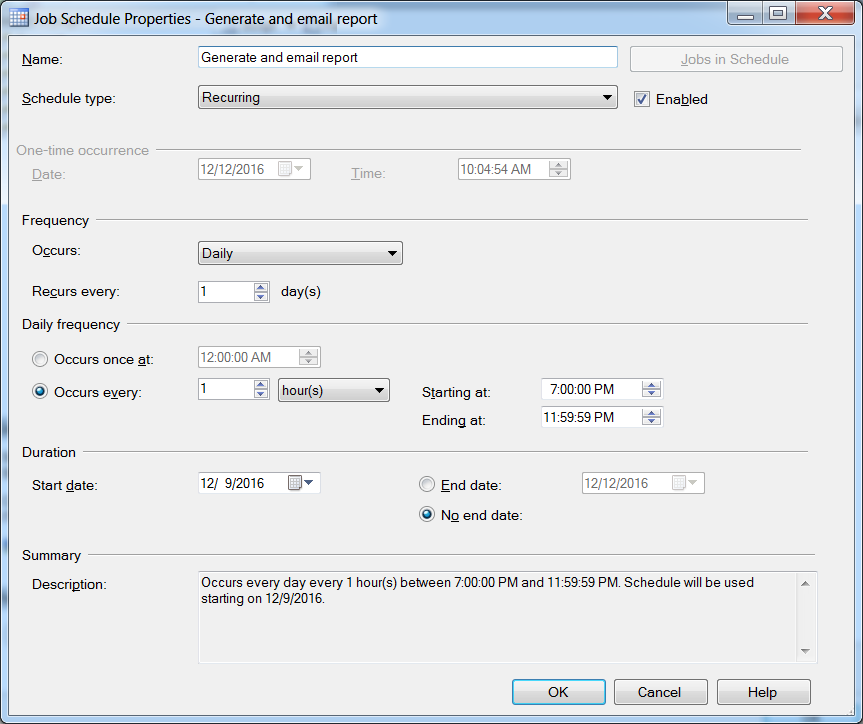 我们有一个Server代理作业,它需要每小时不结束地运行。我相信它是这样配置的。不幸的是,这一次它在晚上11点停止运行。