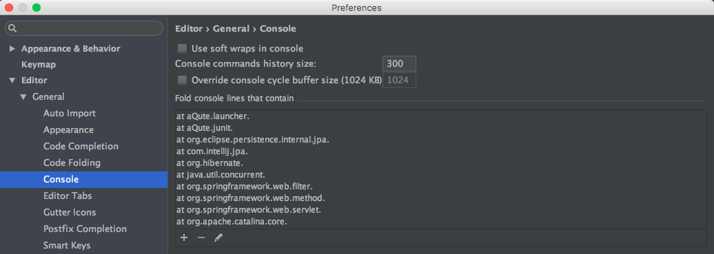 由于您使用的是IntelliJ IDEA,您实际上可以通过打开Preferences > Editor > General > console 在控制台中折叠这些行。在这里,您可以向应该折叠的列表中添加新行。