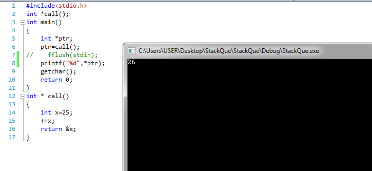 当您创建这个函数并调用它时,函数帧会被推入堆栈中,其中包含一个在堆栈中声明的int变量的空间。现在增加值并尝试返回该值的地址。现在函数结束,堆栈帧被删除。你在试着读它。它会随机返回一些东西。啊,从它的意义上说,不是随机的,而是它返回的东西没有被定义。有时你会得到0,..may 1,23,128749或-7364184。