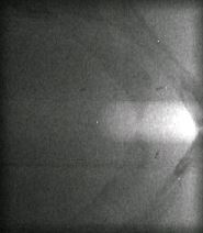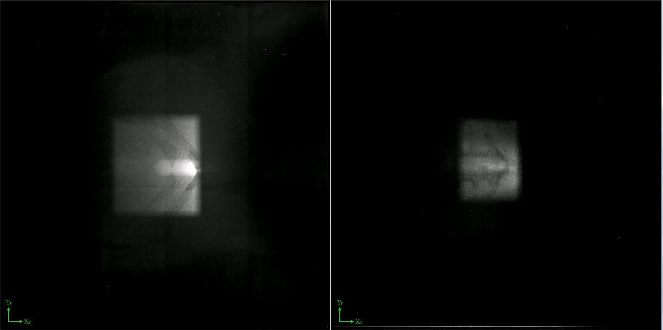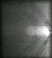 我正在编写一个程序,它使用计算机视觉技术来检测(和跟踪)一个非常嘈杂的图像流中的微小气泡。图像流来自双X射线成像设置,它输出左视图和右视图(由于准直不同,大小不同)。我的数据有两种类型:一组图像不那么嘈杂,我只是用来尝试不同的技术,另一组比较吵,这是检测工作的终点。图像流在60赫兹。这是X射线成像仪的原始图像的一个例子: