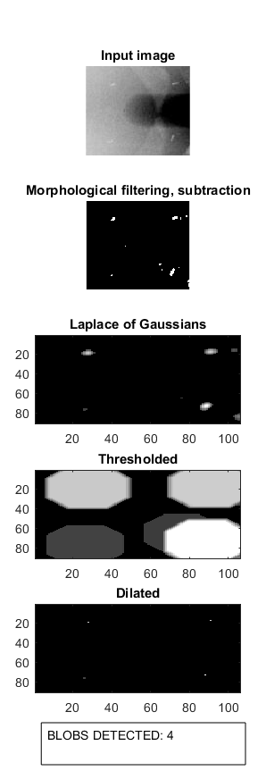 最初,我在OpenCV中使用了一种简单的轮廓/blob检测技术,但这些技术并没有多大帮助。最后,我转向了一些技术,比如使用形态学操作符“打开”图像,然后执行Laplacian的高斯斑点检测来检测感兴趣的区域。这给了我更好的结果的低噪声版本的图像,但失败的时候,涉及到高噪音的:给我太多的假阳性。以下是低噪声图像的结果(请注意输入图像被倒置)。