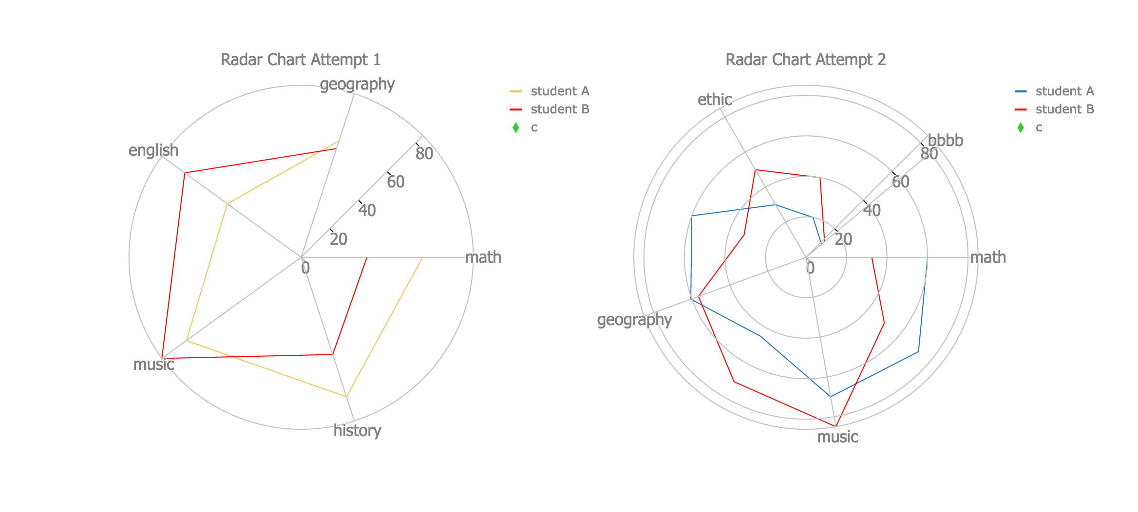 我正在为图片中的左边图表设置激进坐标(r)和角坐标(t),就像这个r: [60, 72.5, 70.0, 45.0, 60.5], t: ["math", "history", "music", "english", "geography"];但是,由于角坐标是字符串,所以我不能将第一个坐标和最后一个坐标与一条线连接起来,就像你在图片中看到的那样。