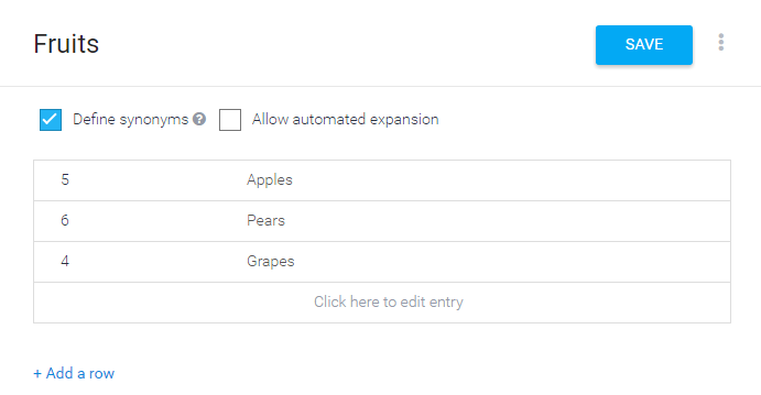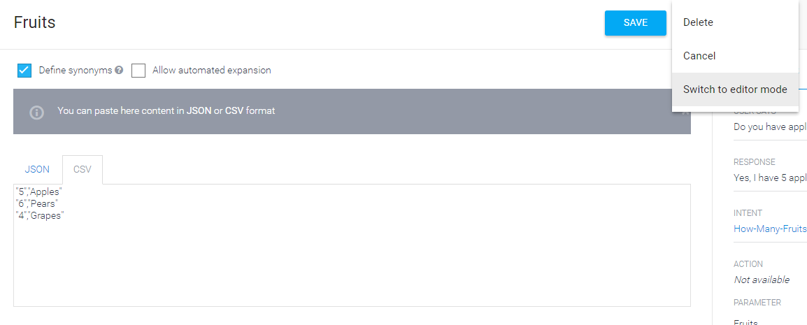 如何在API.ai中引入一组键值对?例如,如何存储这样的数据:
