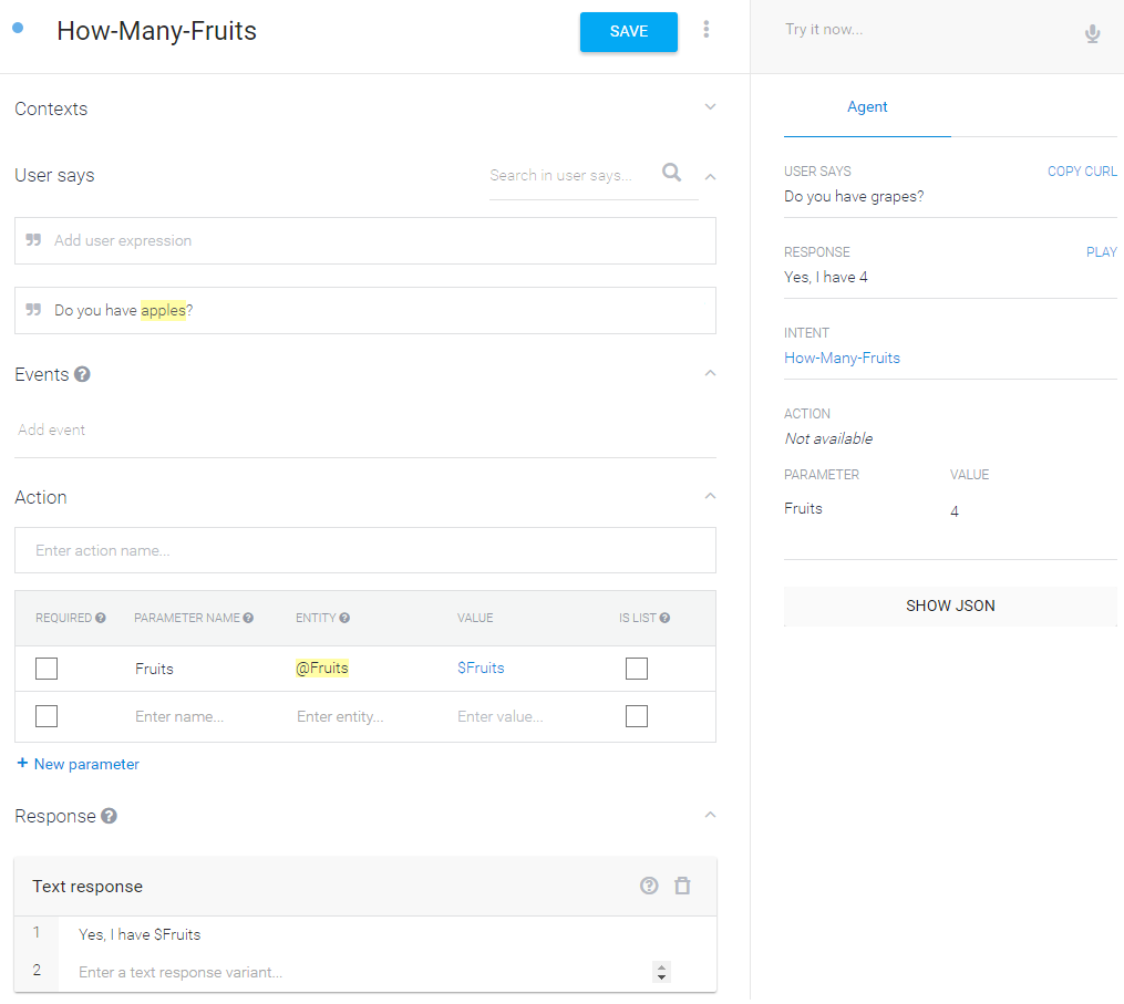 要在Api.ai中创建一个简单的Google应用程序,您至少需要一个意图和一些实体,这取决于您想要做什么。在Google开发人员发布的个人厨师示例中,您有一些实体,如菜、蔬菜等,非常简单。链接到视频