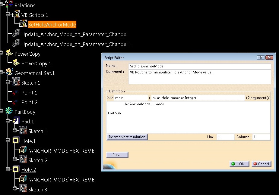 属性锚定模式不公开为KBE。但是,它是针对VB的。因此,您可以创建一个简单的“带参数的VBScript”特性,您可以使用它来设置属性。